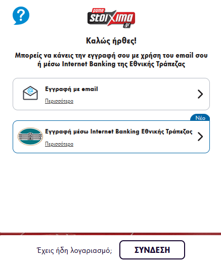 - Στο πεδίο που εμφανίζεται σας δίνονται δύο επιλογές. Η πρώτη είναι εγγραφή με mail, η δεύτερη μέσω Internet Banking της Εθνικής Τράπεζας της Ελλάδας. Προσωπικά επέλεξα να κάνω εγγραφή μέσω email.
