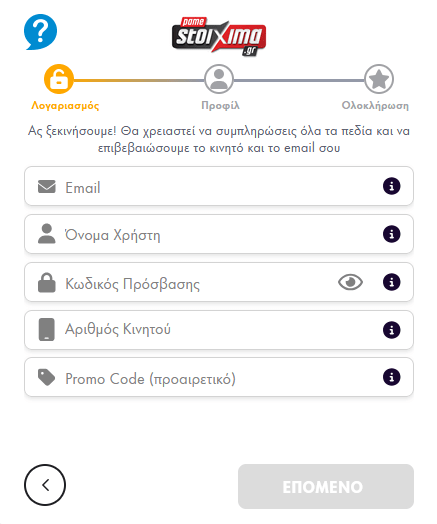 - Στο κουτάκι που άνοιξε συμπλήρωσα email, όνομα χρήστη, κωδικό πρόσβασης, αριθμό κινητού. Αν έχετε και κάποιον Promo code προαιρετικά μπορείτε να τον καταγράψετε. Αφού τα κάνετε όλα αυτά πατάτε «Επόμενο» και συνεχίζετε.