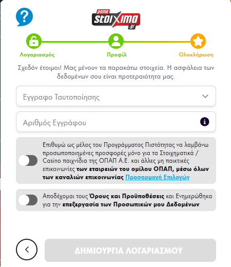 - Κατόπιν επιλέγετε έγγραφο ταυτοποίησης που θα χρησιμοποιήσετε (ταυτότητα ή διαβατήριο), γράφετε αριθμό του εγγράφου, αποδέχεστε όρους και προϋποθέσεις και βάζετε προαιρετικά αν θέλετε να λαμβάνετε προσωποποιημένες προσφορές*. Αφού τα κάνετε όλα αυτά, μετά πατάτε «Δημιουργία Λογαριασμού».
